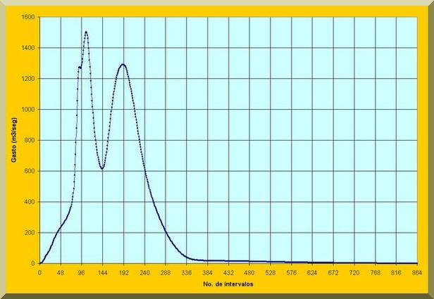 Flood hydrograph, 500-yr return period, upstream of the project, in m3/sec, at intervals of 7.5 min. |