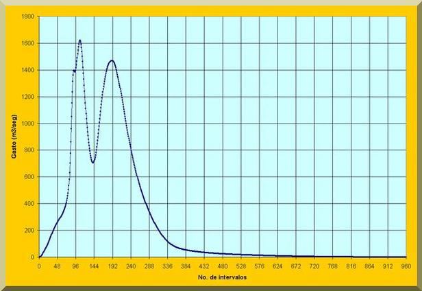 Flood hydrograph, 1000-yr return period, upstream of the project, in m3/sec, at intervals of 7.5 min. |