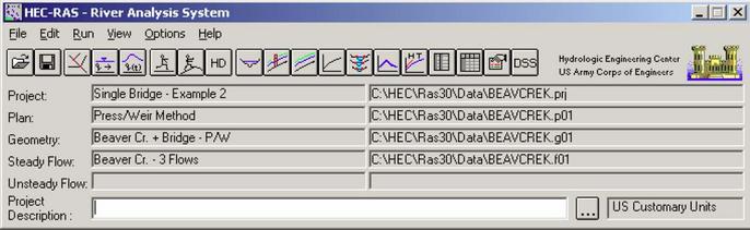 Also on the HEC-RAS main window is a Button bar (Figure 3.4). The Button bar provides quick access to the most frequently used options under the HEC- RAS menu bar.