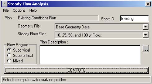 • Once the modeler has selected a Plan and set all of the calculation options, the steady flow calculations can be performed by pressing the Compute button at the bottom of the Steady Flow Analysis window.