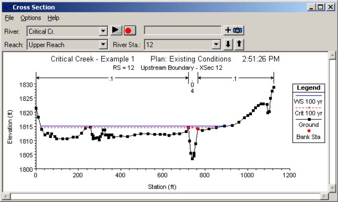 • The computed water surface profiles can be overlaid on top of the cross section data.