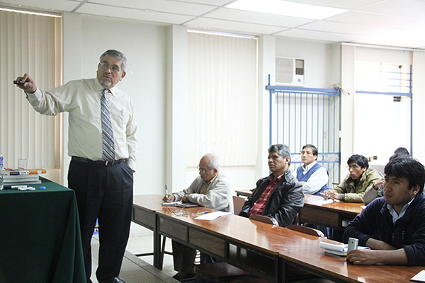 | En la Facultad de Ingeniería Agrícola, UNA La Molina, Lima, disertando sobre ingeniería de sedimentos, junio de 2013. |