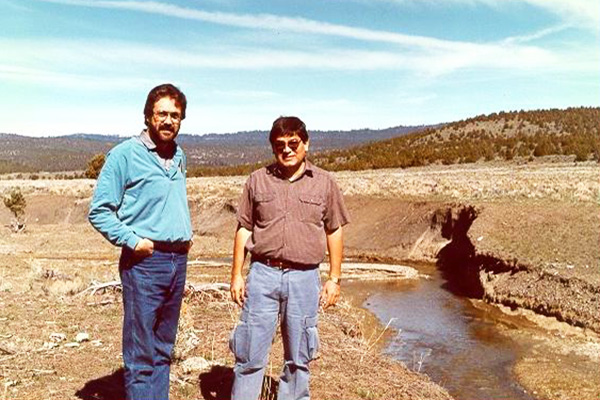 | Con mi colega Efraín Díaz, inspeccionando el Arroyo Camp, en Oregon, EE.UU., durante el estudio de aumento del flujo de base, apoyado por Pacific Gas and Electric Company (PG&E), julio de 1989. |
